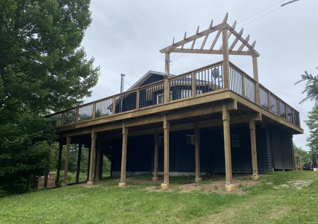 Removed two separate decks and built one large wraparound deck along the back and sides of the home, complete with a pergola. Reinforced structure to support a future hot tub.